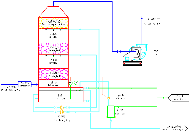 廢氣收集處理系統按照生產(chǎn)區間劃分,實(shí)行獨立控制。廢氣處理塔均采用進(jìn)口優(yōu)質(zhì)PP材料制作,集中布置于室外。